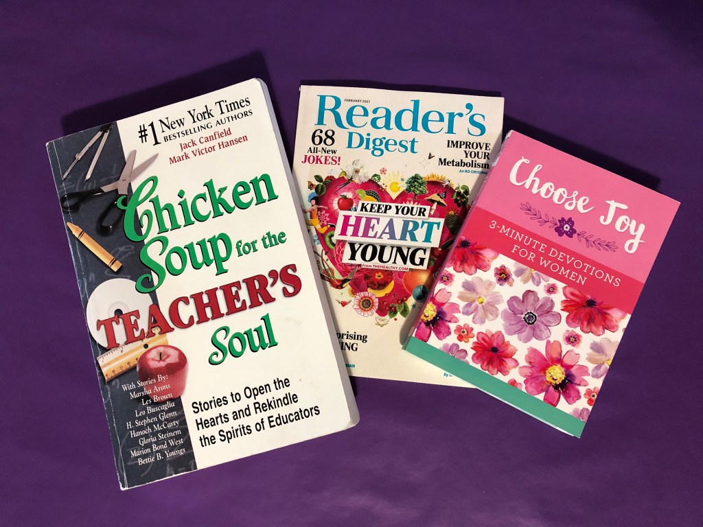 6. Reading novels is replaced with very short stories from magazines, daily devotional books, Reader’s Digest, or even one that was my “go-to” favorite – Chicken Soup for the Soul.